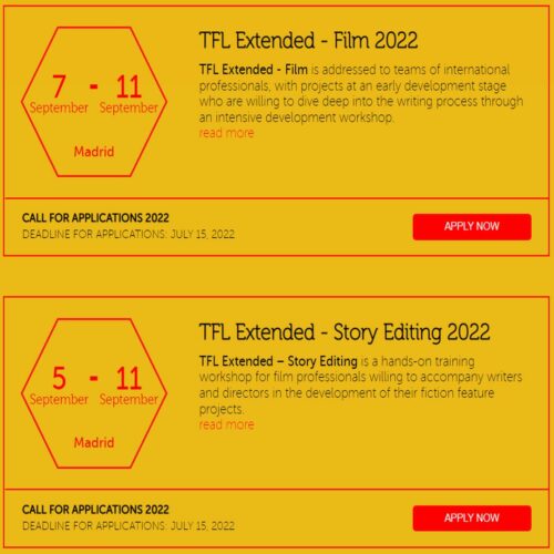 TorinoFilmLab abre plazo de inscripción para el programa formativo Extended, que realizará las nuevas ediciones de sus talleres de formación TFL Extended Story Editing y TFL Extended Film en Madrid con apoyo de la Comunidad y el Ayuntamiento de Madrid. Un programa intensivo de formación del prestigioso laboratorio internacional de desarrollo de proyectos, cuya convocatoria permanecerá abierta hasta el 15 de julio.