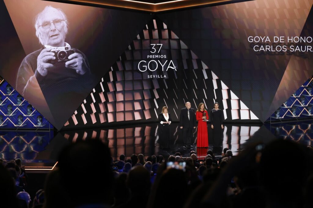La gala se transformó en un emotivo acto de homenaje a Carlos Saura, Goya de Honor 2023, que falleció el viernes en su domicilio de Madrid. Se reconoció así la figura de uno de los mejores cineastas españoles de todos los tiempos y a su polifacética obra cinematográfica y sus proyectos artísticos durante setenta años, que ha culminado con el reciente estreno en salas de su documental Las paredes hablan. El director pudo ver cumplido su deseo de tener entre sus manos el Goya de Honor otorgado por la Academia, cuya sede acogerá el próximo lunes la capilla ardiente.