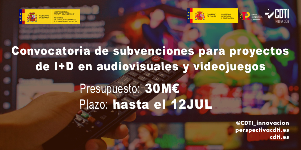 La convocatoria de ayudas del programa Proyectos de I+D de tecnologías audiovisuales y de los videojuegos abre plazo de solicitud desde el 28 de mayo hasta el 12 de julio de 2022. Una convocatoria del Centro de Desarrollo Tecnológico Industrial (Ministerio de Ciencia e Innovación), dirigida a pequeñas y medianas empresas, que tiene como objeto de actuación la financiación de proyectos de desarrollo de nuevas tecnologías de aplicación al ámbito audiovisual y de los videojuegos y al desarrollo de tecnologías innovadoras propias del ámbito de los videojuegos o audiovisual para su aplicación en otros entornos.