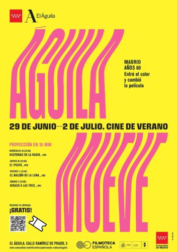 Un ciclo de cine de verano que compartirá espacio con la propuesta musical El Águila Suena del 21 al 26 de junio. Dos festivales de cine y música para rendir homenaje al Madrid de los años 60 y que permitirán a más de 2300 espectadores disfrutar de la conservación y difusión del rico patrimonio musical y cinematográfico español, en palabras de Marta Rivera de la Cruz, consejera de Cultura, Turismo y Deportes de la Comunidad de Madrid, durante la presentación en la cual destacó una localización tan emblemática para la ciudad y la región como la antigua fábrica de El Águila.