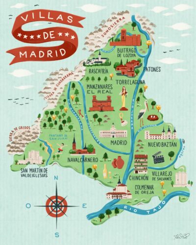 Las ilustraciones muestran los rincones más significativos de las once Villas de la Comunidad, incluyendo paisajes de San Martín de Valdeiglesias, Torrelaguna, Manzanares El Real, Colmenar de Oreja, Navalcarnero, Rascafría, Buitrago del Lozoya, Villarejo de Salvanés, Patones, Chinchón y Nuevo Baztán.