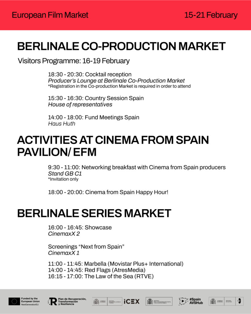 Audiovisual from Spain e Iberseries & Platino Industria organizan, por segunda vez consecutiva en Berlinale Series Market, las sesiones Next from Spain (First Look + Q&A) en CinemaxX 2 el 20 de febrero, donde se proyectará un avance de los próximos estrenos más relevantes de series de ficción en español seleccionados por convocatoria. Después de cada screening, se programará un encuentro con los talentos creativos y ejecutivos partícipes de las producciones con turno de preguntas abierto a los asistentes.