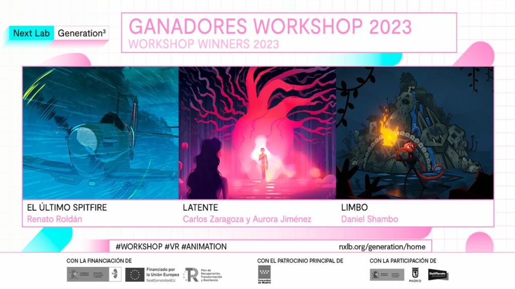 Los proyectos españoles Latente de Carlos Zaragoza y Aurora Jiménez, El último spitfire de Renato Roldán, y LIMBO proyecto colombiano de Daniel Shambo son los galardonados en Next Lab Generation 2023, el workshop de referencia para el sector de la animación. El taller especializado en el uso de nuevas tecnologías disruptivas para mejorar los procesos de producción completa una tercera edición en Madrid con cifras que reflejan su crecimiento e importancia en el sector, con 400 acreditados (duplicando la cifra del pasado año), y un total de 60 proyectos recibidos de 13 países. Una edición que además ha incorporado destacados anuncios como escaparate del sector y una dotación económica a los tres premios. Una iniciativa que abarca el ámbito formativo, el lanzamiento de nuevos talentos, laboratorio de I+D+i y espacio de debate sobre el presente y futuro de los procesos creativos y productivos, que en palabras de su director José Luis Farias, posiciona la cita como evento clave y a la vanguardia del sector de la animación.