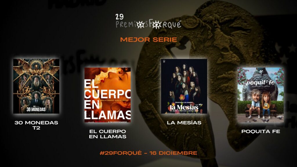 La serie La Mesías, dirigida por Javier Calvo y Javier Ambrossi, los Javis, se alzó como la producción audiovisual con mayor número de nominaciones. Entre sus cinco candidaturas, figuran dos dobletes en las categorías a Mejor Interpretación Masculina en Series (Albert Pla, Roger Casamajor) y Mejor Interpretación Femenina en Series (Ana Rujas, Lola Dueñas). La serie de ficción competirá con la segunda temporada de 30 Monedas, El cuerpo en llamas, con dos nominacionesy Poquita Fe, con tres nominaciones, por alzarse con el Premio Forqué a la Mejor Serie de Ficción, que asciende a 6.000€.
