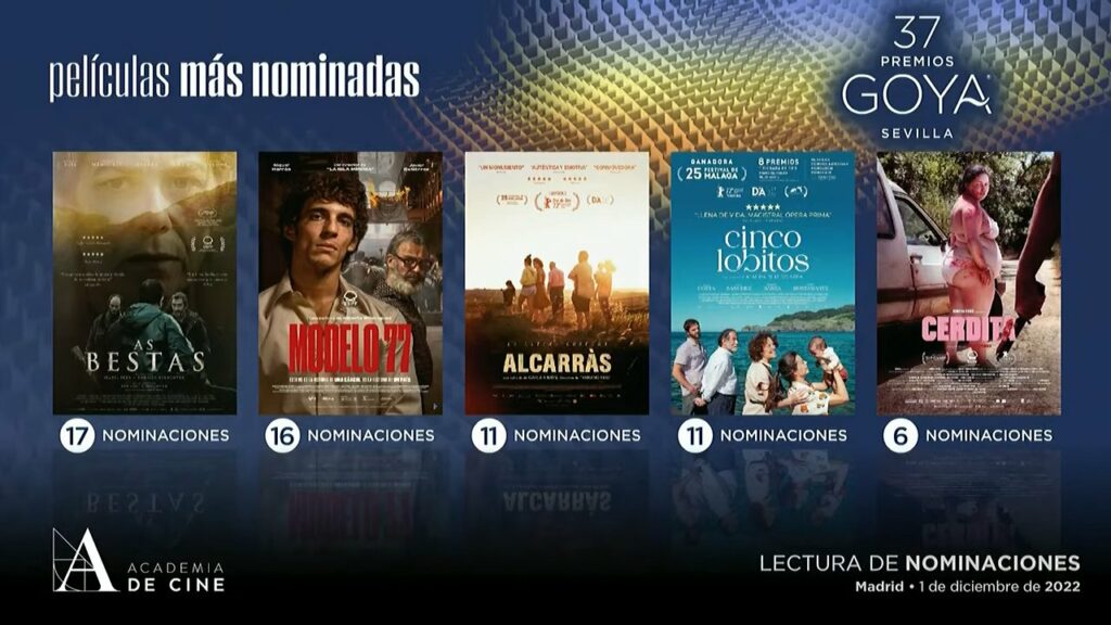 Los largometrajes As bestas (17 nominaciones), Cinco lobitos (11 nominaciones), Cerdita (6 nominaciones) y Mantícora (4 nominaciones) han recibido apoyo por parte de la Comunidad de Madrid. Entre las nominaciones obtenidas, As bestas y Cinco lobitos competirán en la categoría de Mejor Película, tras una gran trayectoria de premios y taquilla.